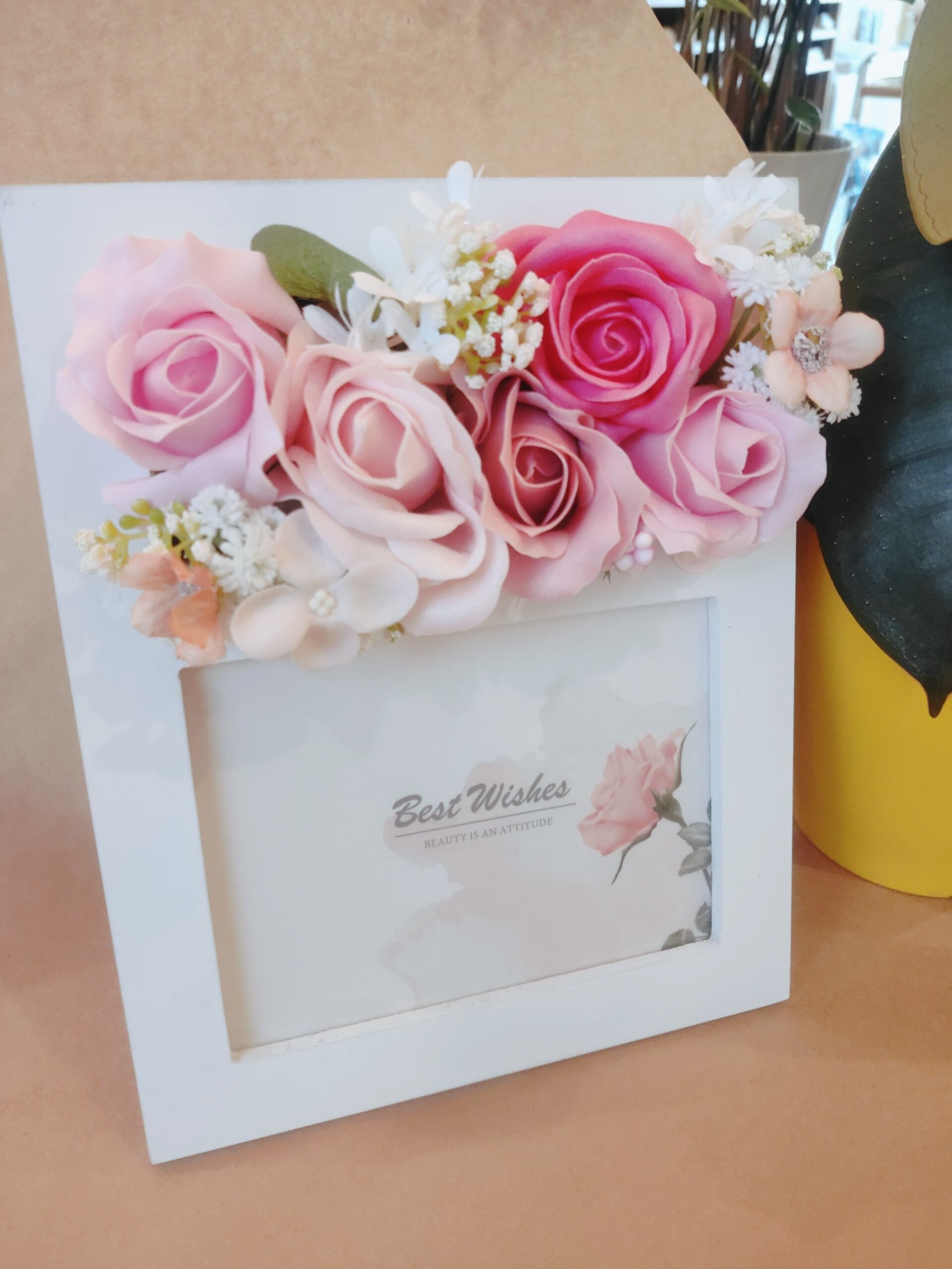フレームにソープフラワーをあしらった華やかなフォトフレームです。
