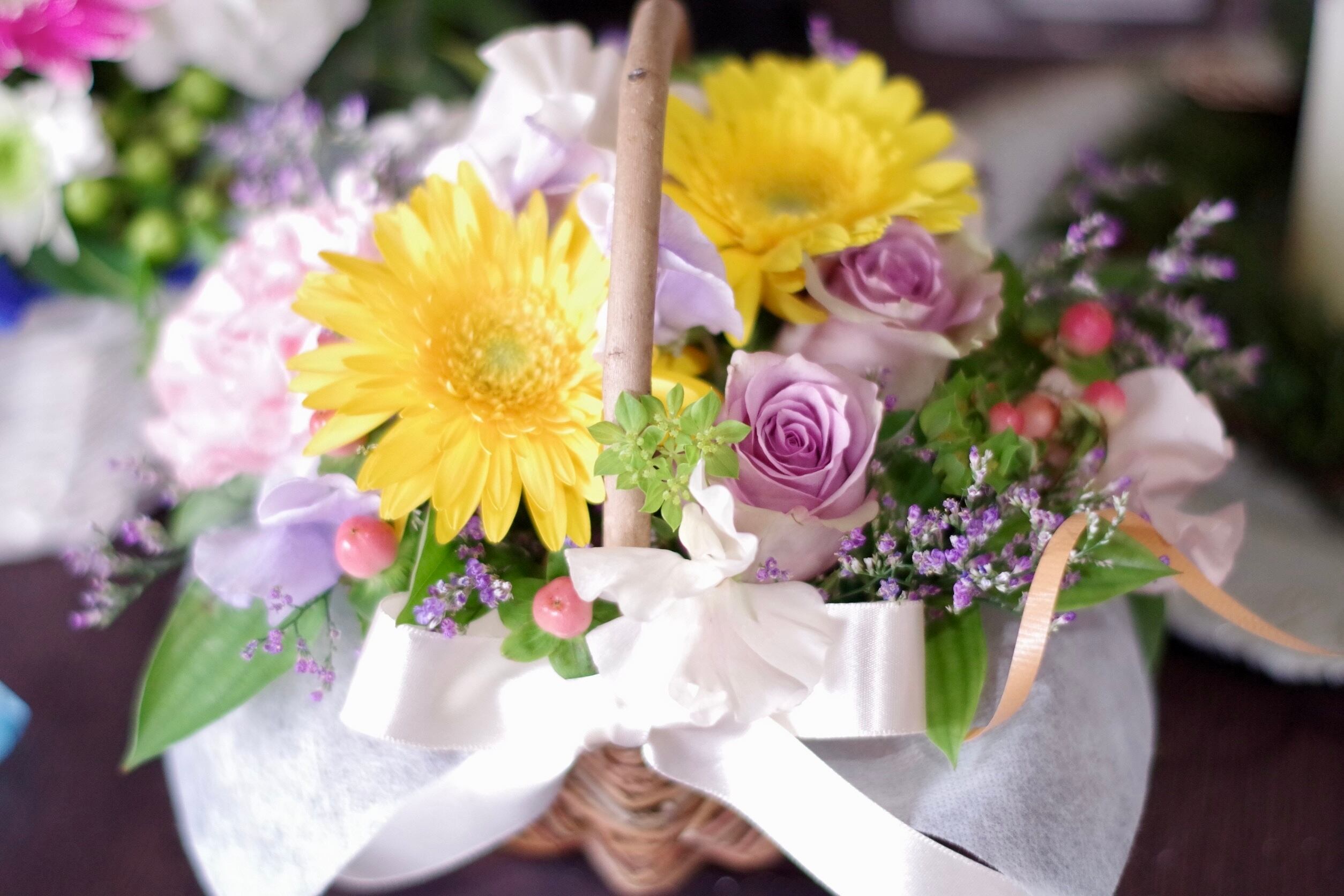 Sサイズのバスケットに溢れるお花達を詰め込んだ生花アレンジメントです。
